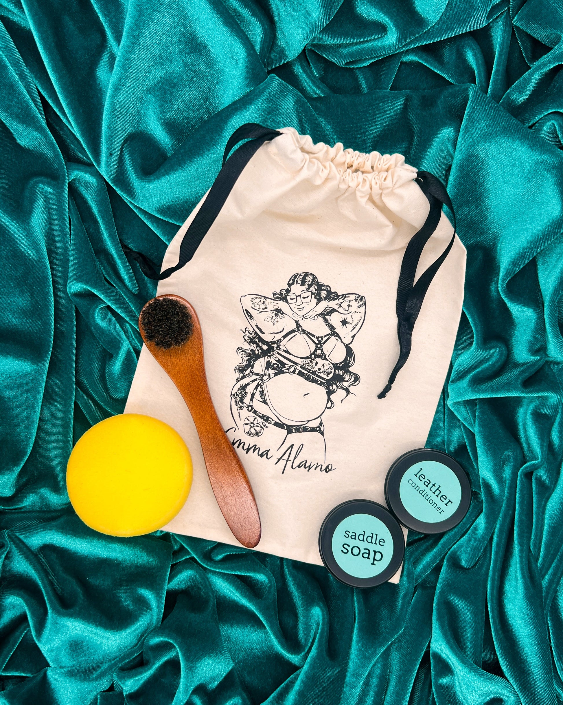 Keep your harness clean and supple with this basic leather care kit! This custom dust bag contains a 1-ounce tin each of Fiebling's Saddle Soap and our homemade Saddle Butter, a sponge, and a wood-handled bristle brush. Here's how to use them!